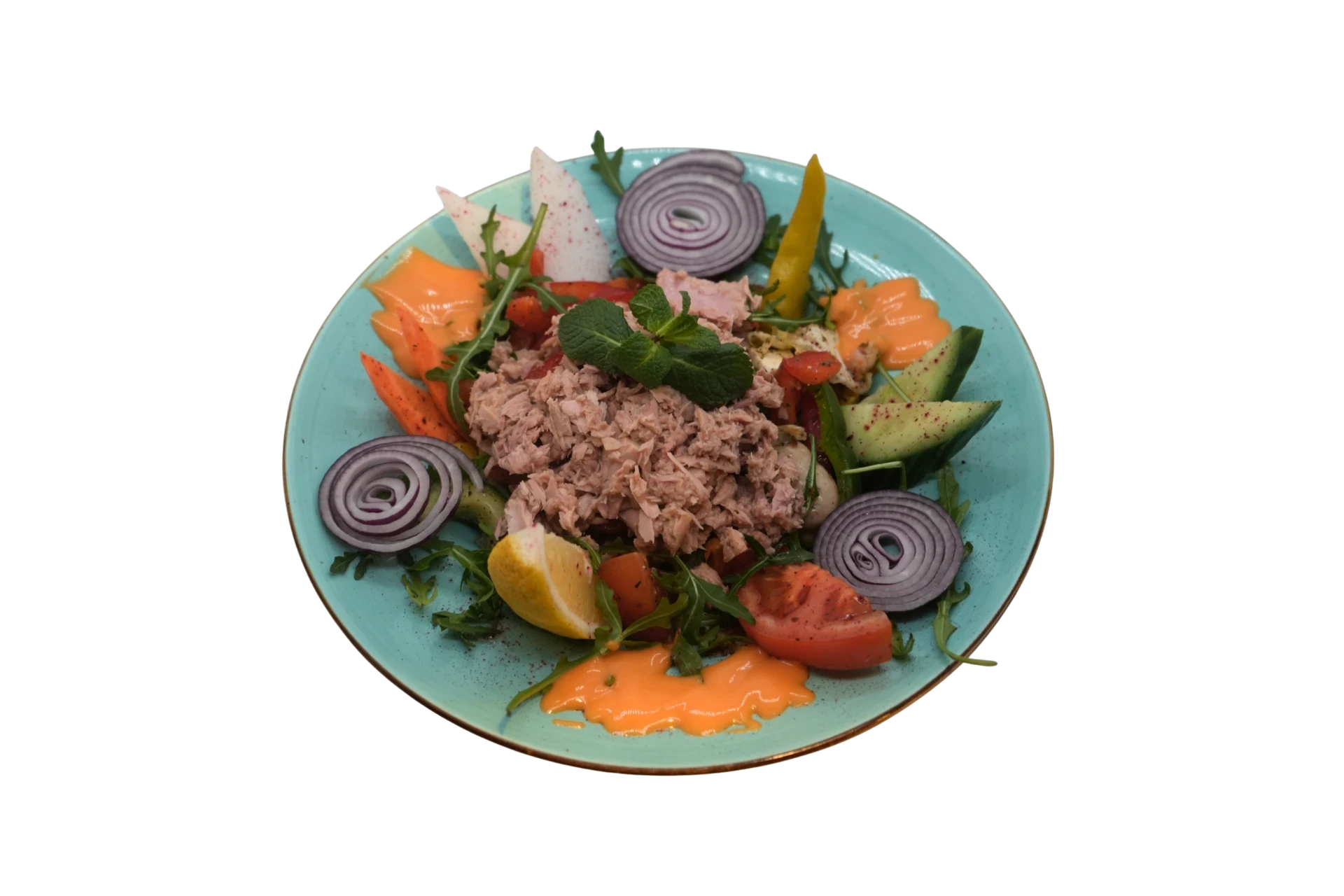 Mit Tomatensoße, Gouda, Zwiebel und Thunfisch