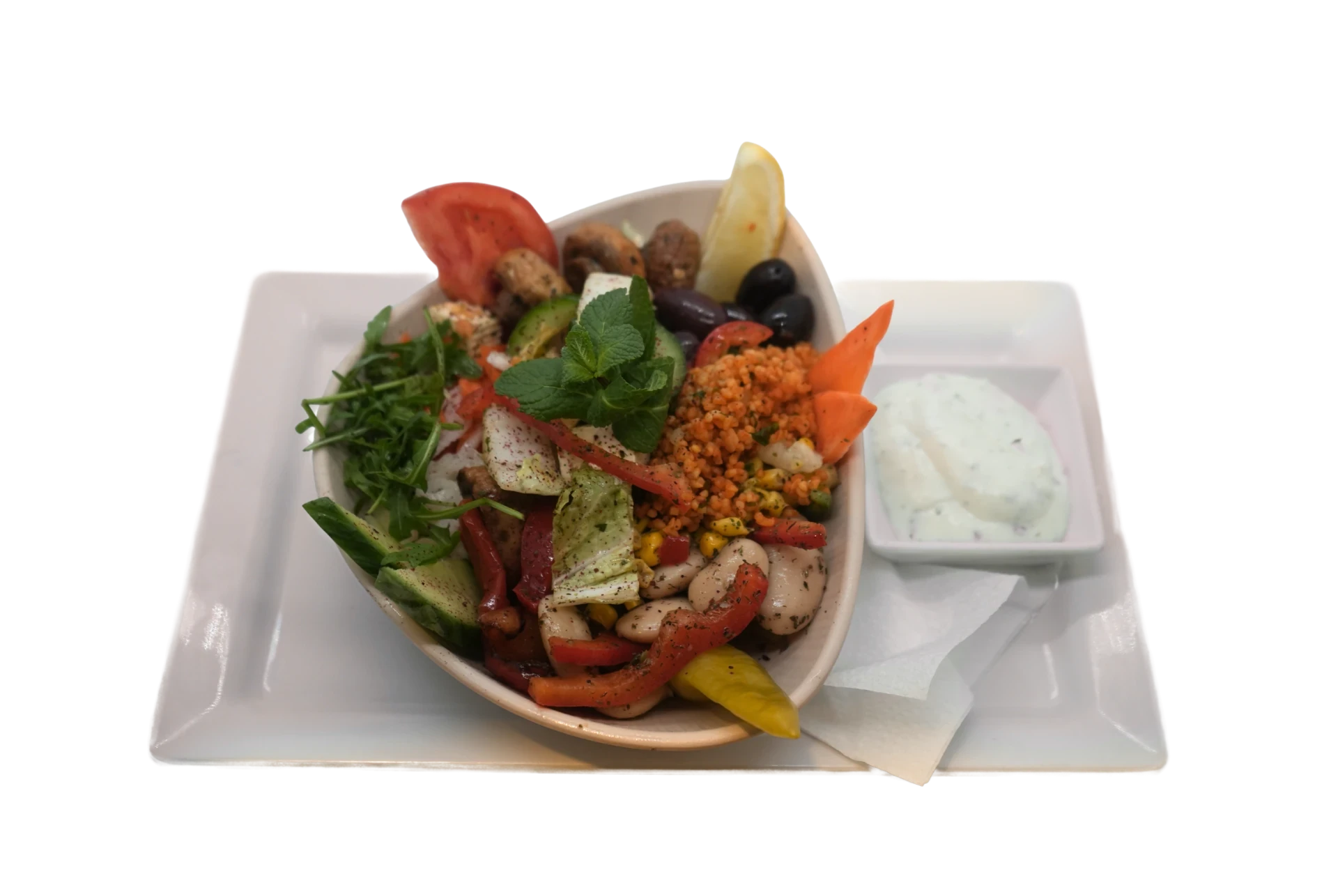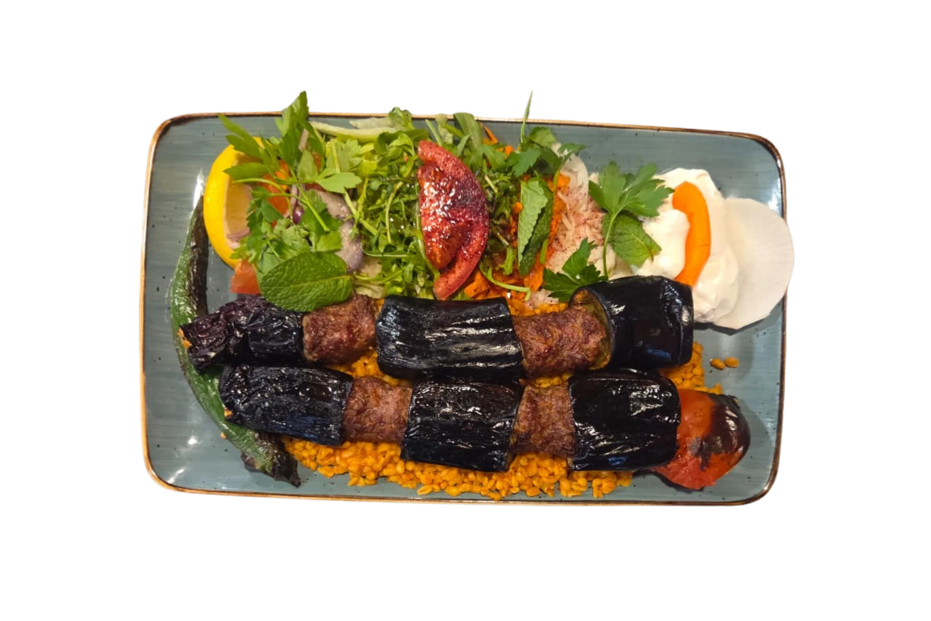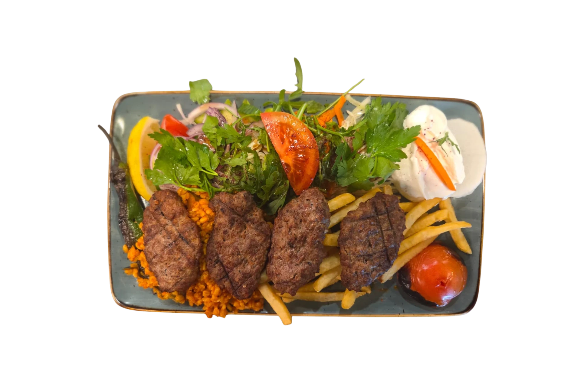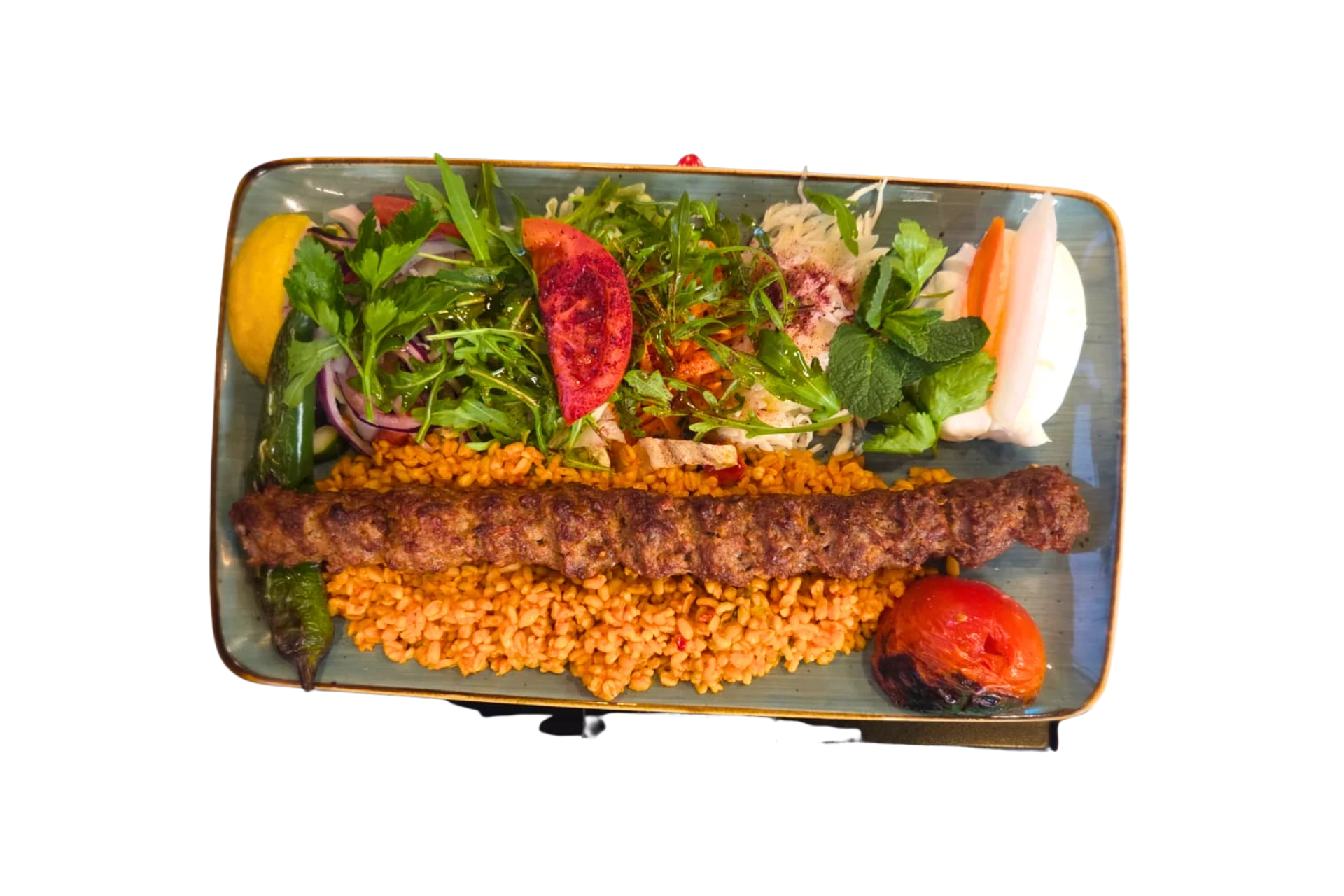 Halbe Lammfleischspieß, Lammkoteletts, Halbe Adana Kebab, Hähnchenfilet, kleine Lahmacun mit Reis oder Pommes und Salat